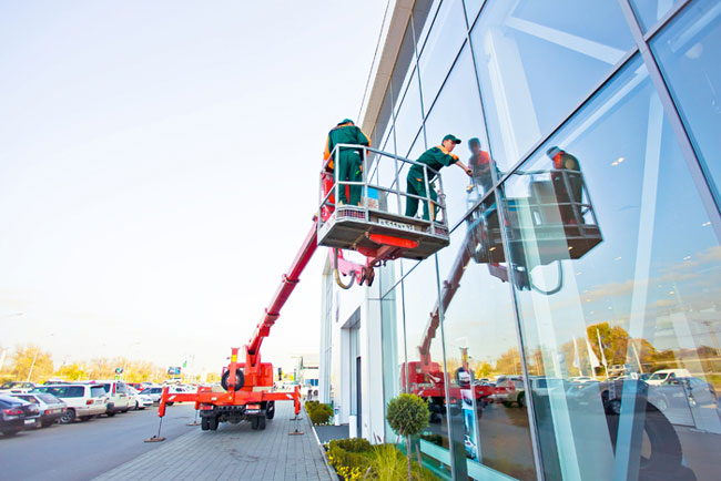 - Мойка фасада на большой высоте с использованием специальных подъемных приспособлений, требующая соответствующих навыков.