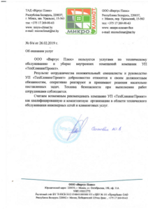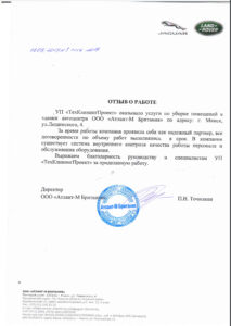 Наше сотрудничество с Унитарное предприятие «ТехКлинингПроект» оставляет благоприятные впечатления. Обязательства, взятые организацией по договору, выполняются в срок и в полном объеме. Сотрудники данной организации хорошо зарекомендовали себя с профессиональной стороны, обеспечив качество выполняемой работы, учитывают пожелания Заказчика. Мы надеемся на...