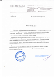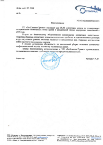ООО «Виртус Плюс» пользуется услугами по техническому обслуживанию и уборке внутренних помещений компании Унитарное предприятие «ТехКлинингПроект». Результат сотрудничества положительный: специалисты и руководство Унитарное предприятие «ТехКлинингПроект» добросовестно относятся к своим должностным обязанностям, оперативно реагируют и принимают решения касательно поставленных задач. Техника...